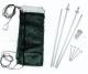 Dvoudílné kovové tyče složíme - zapustíme do země - pomocí provázků a zemnících kolíku upevníme - napneme síť.