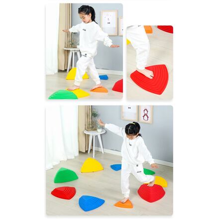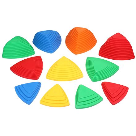 Sada Balance Stepping Stones obsahuje 11 plastových nášlapných bloků ve tvaru trojúhelníku, které umožňují sestavit zábavnou dráhu pro děti. Tato hra formou tréninku podporuje jejich koordinační dovednosti, rovnováhu a prostorovou orientaci.