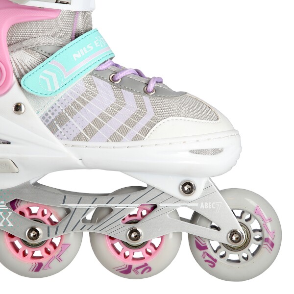 NILS Extreme NH18192 jsou kolečkové brusle 4v1 s vyměnitelným nožem na led, které jsou určeny pro začínající a středně pokročilé uživatele. Hliníkový podvozek je osazen měkkými PU kolečky s ložisky ABEC7 pro svižnou jízdu. Vnější bota je pomocí stisku tlačítka nastavitelná do čtyř velikostí, toto řešení umožňuje precizní přizpůsobení velikosti podle aktuálních potřeb anebo se používá jako "rostoucí bota", která "roste" spolu s nohou dítěte. Na špičce jsou ventilační otvory pro maximální prodyšnost. Vnitřní bota je vyrobena z kombinace semiše, síťoviny MESH, EVA a pěny o vysoké hustotě. Zapínání je řešenou klasickou trojkombinací - šněrování, řemínek se suchým zipem a dvousekční přezka. Součástí balení je sada šroubů a podložek pro přestavbu podvozku do konfigurace 2+1 a 2+2 a pár nožů na led, které jsou vyrobeny z nerez oceli s vysokým podílem uhlíku.
