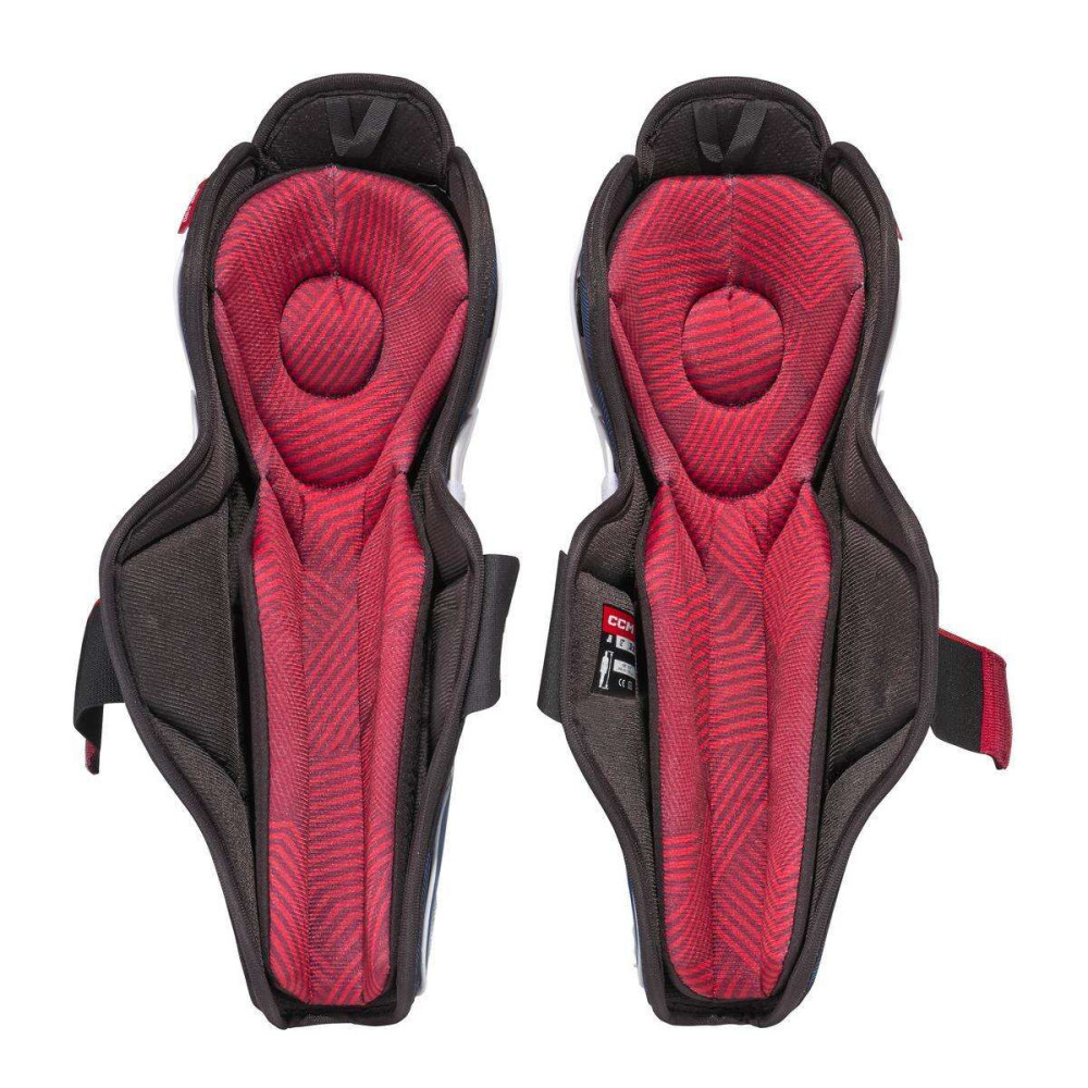 Snadné nastavení holeně zajišťují nylonový horní zajišťovací popruh a široký elastický lýtkový popruh. Anatomická geometrie krytí holení spolu s řemínkovou drážkou zaručuje stabilní a spolehlivou ochranu, a to i při intenzivním pohybu na ledě.