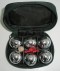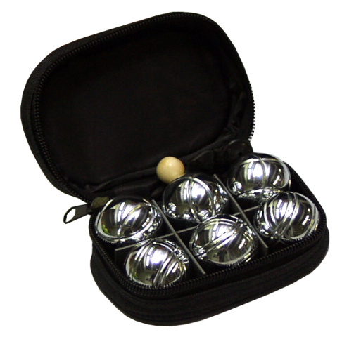 Mini sada Petanque v nylonovém pouzdře, 6 kusů chromovaných koulí, 1 dřevěný jack a měřidlo.