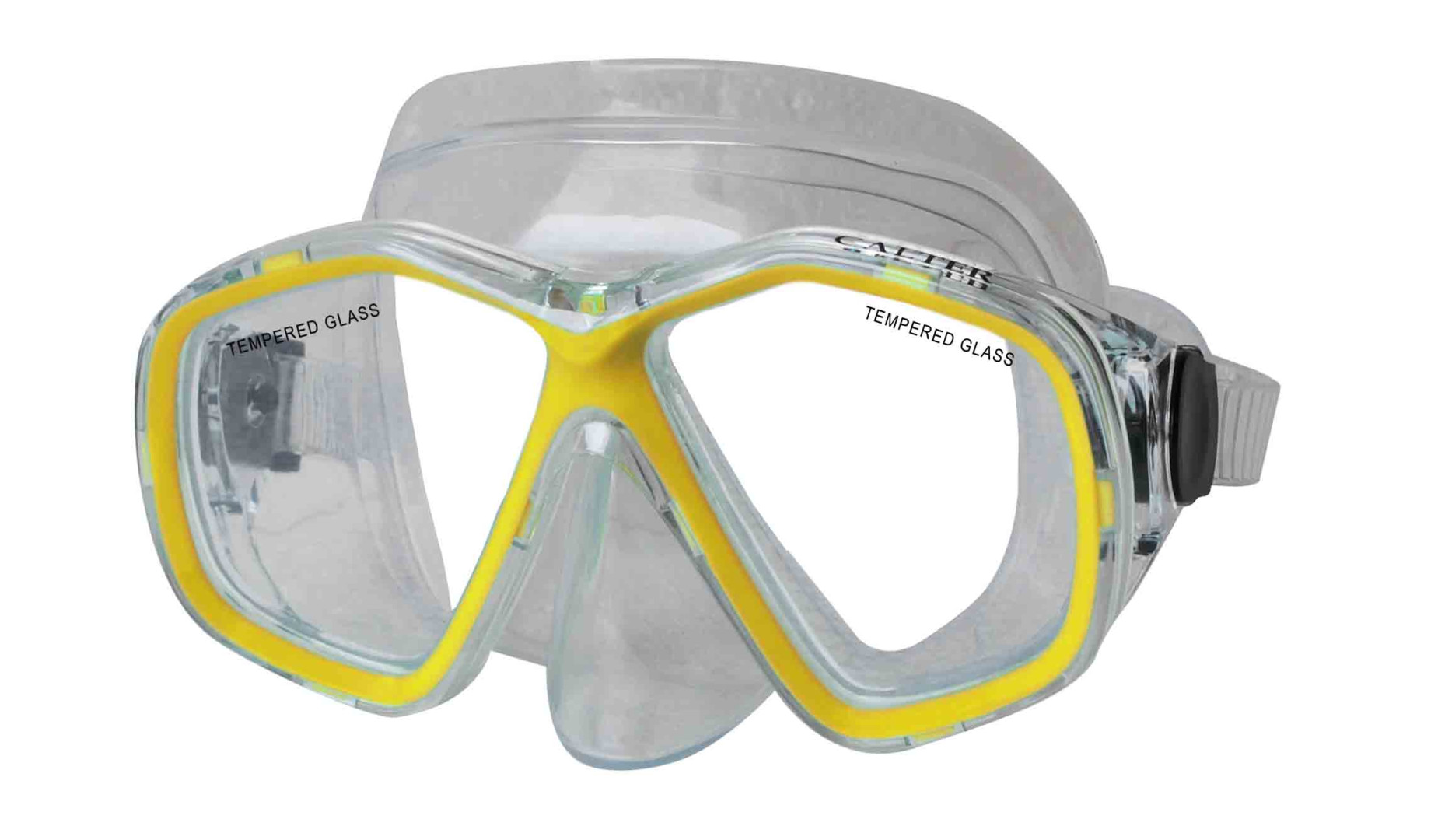 Potápěčská maska Calter ve žluté barvě s tvrzeným sklem a nastavitelným páskem pro potápění a šnorchlování.