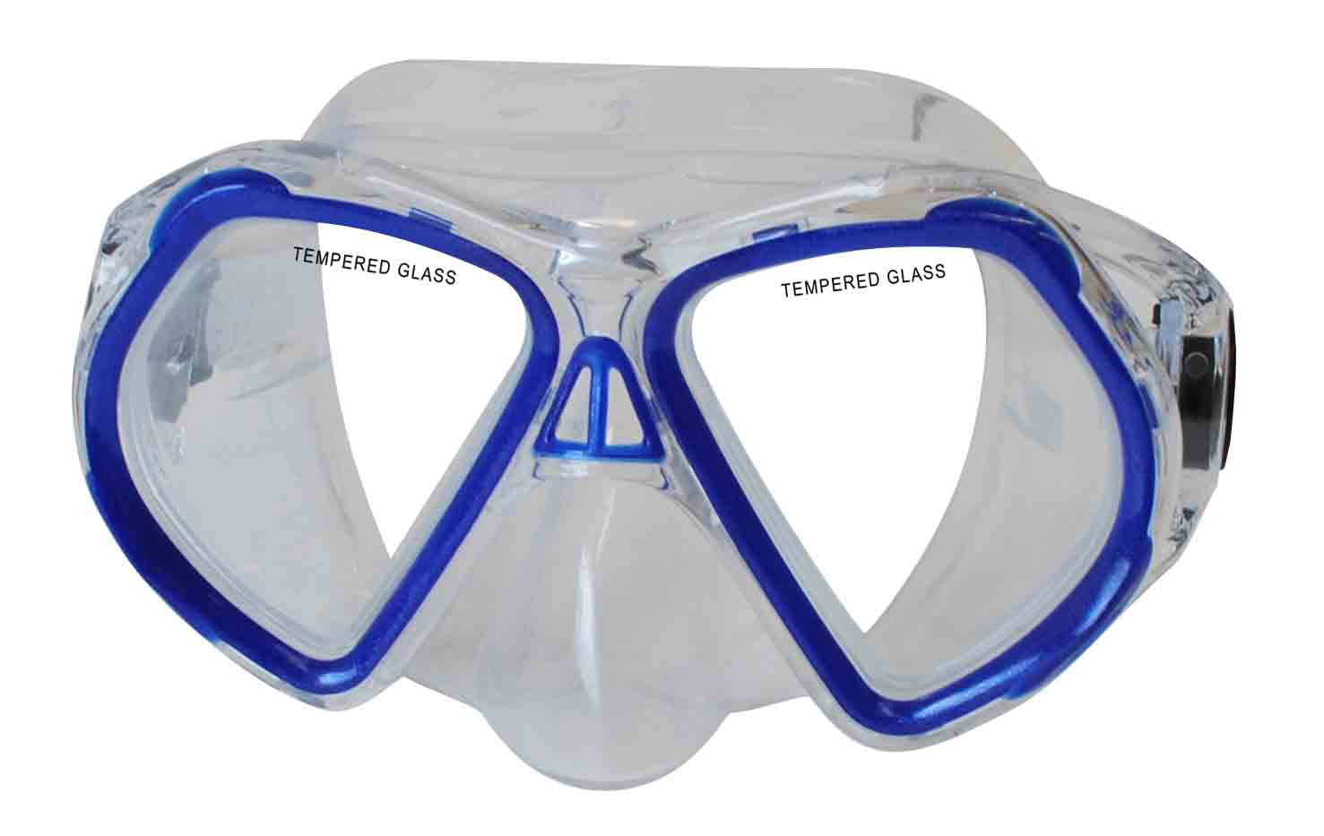 Potápěčská maska v modré barvě s tvrzeným sklem a nastavitelným páskem pro potápění a šnorchlování.