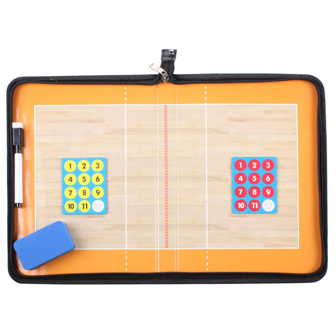 Magnetická trenérská tabule po rozložení znázorňuje celé volejbalové hřiště. Její zazipovaný penál s tvrdými deskami je zhotovený ze syntetické PU kůže s oděruvzdornými vlastnostmi.